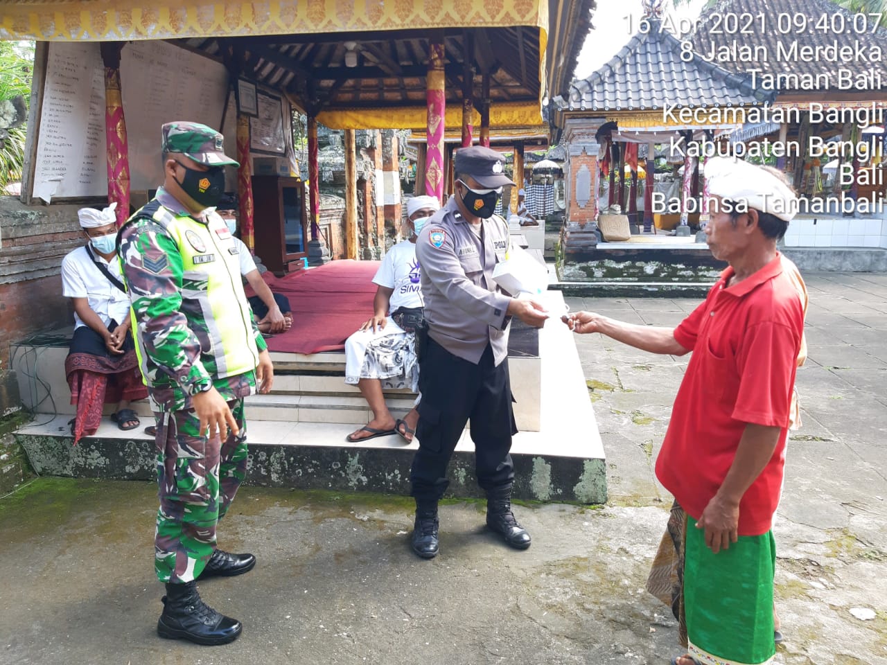 Babinsa Tamanbali, Serka I Komang Juni Suantara, bersama Tim Satgas Posko Terpadu Penanganan Covid-19 Desa Tamanbali memberi 200 potong masker kepada Kelian Pengempon Pura Penataran Pande dan Penataran Sima Siladan, Desa Tamanbali. Pembagian masker dilakukan sehubungan dengan upacara piodalan, Jumat (16/4/2021).