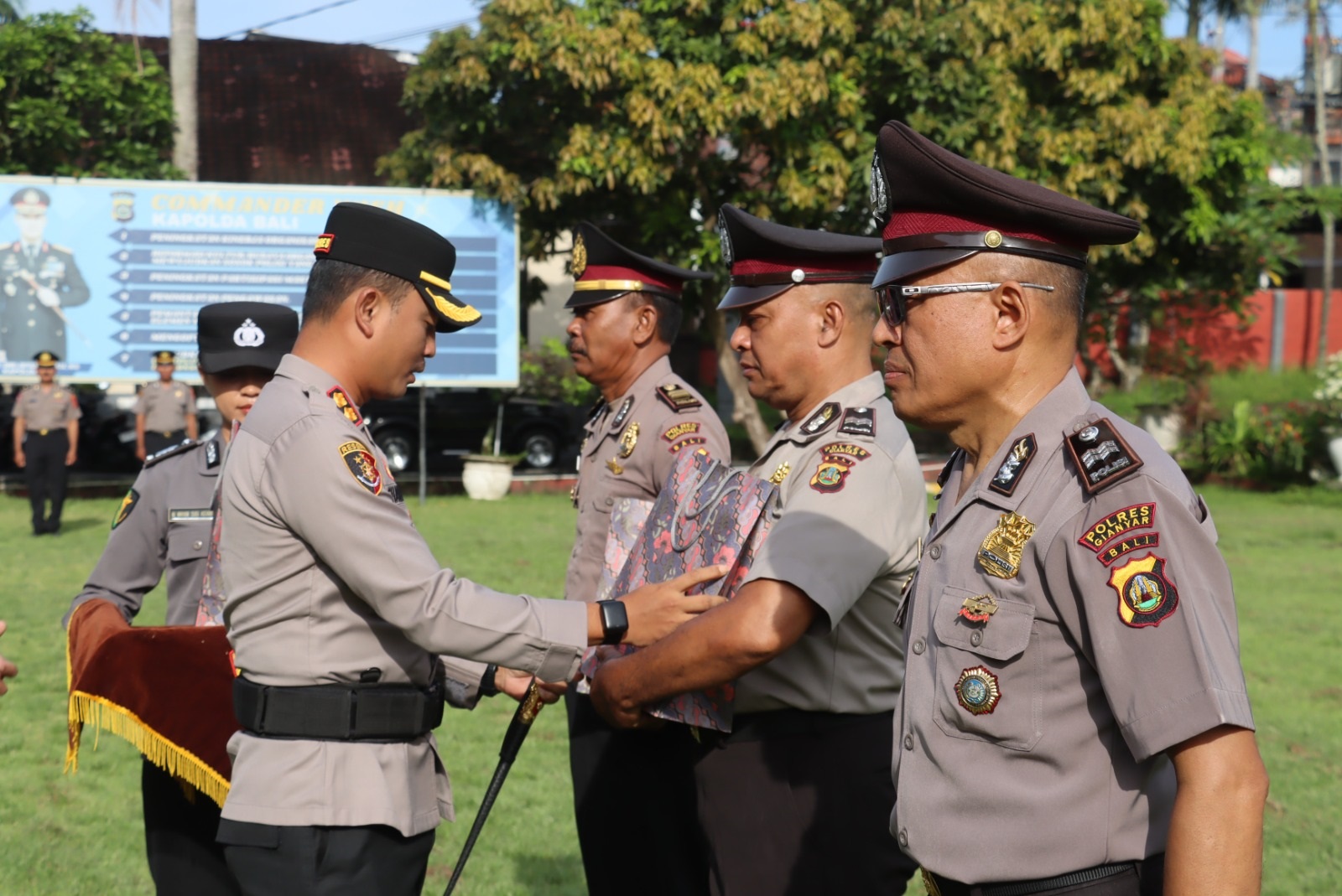 Personel yang menerima kenaikan pangkat perwira pengabdian yaitu Ipda I Gusti Ngurah Gede, jabatan Bhabinkamtibmas Kelurahan Gianyar, Polsek Gianyar; dan Ipda I Wayan Rika, jabatan Ba. SPKT Polsek Ubud. Untuk personel yang dilepas memasuki masa purnabakti yakni Iptu I Nyoman Sadia, jabatan Pama Polres Gianyar; Iptu I Made Wandera, jabatan Pa. Polsek Tampaksiring; dan Aiptu I Ketut Budiasa, jabatan Banit. Turjawali Satuan Samapta Polres Gianyar.