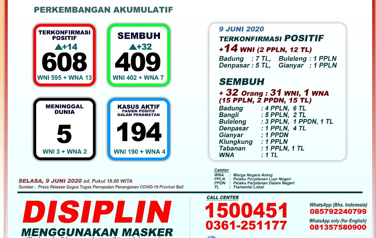 Dijelaskan, rincian 32 orang sembuh itu terdiri dari 1 WNA (transmisi lokal) dan 31 WNI (15 orang PMI, 2 imported case Indonesia dan 14 orang transmisi lokal). ”Sehingga total pasien yang telah sembuh sejumlah 409 orang,” jelas Dewa Indra seraya menambahkan, jumlah pasien yang meninggal tetap 5 orang (2 WNA, 3 WNI).