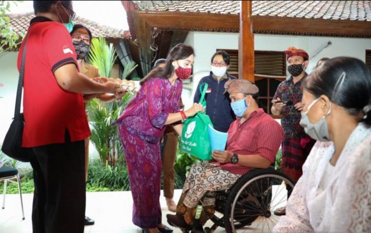 Pada kesempatan itu, Surya Adnyani Mahayastra yang didampingi Kadis Sosial Kabupaten Gianyar AA Putri Ari menyerahkan bantuan paket sembako untuk 89 penyandang disabilitas se-Kabupaten Gianyar. Bantuan ini merupakan bentuk kepedulian Bupati Gianyar pada penyandang disabilitas dalam situasi pandemi Covid-19. yes