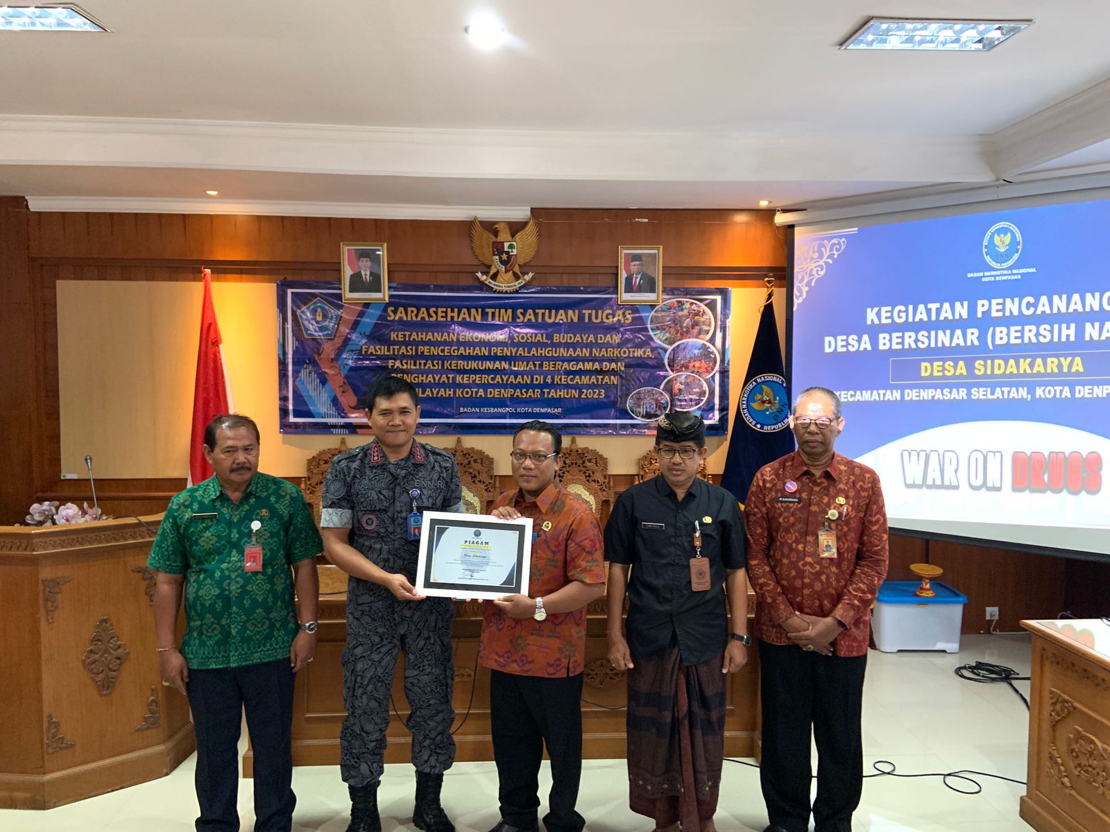 Acara diawali dengan penyerahan SK Wali Kota Denpasar tentang Desa Bersinar Sidakarya, dilanjutkan dengan penyerahan piagam penghargaan oleh Kepala BNN Kota Denpasar kepada Perbekel Desa Sidakarya. Kegiatan ini dihadiri oleh Kepala Badan Kesbangpol Kota Denpasar yang sekaligus sebagai Pelaksana Harian Tim Terpadu P4GN, Kepala DPMD Kota Denpasar, Camat Denpasar Selatan dan tokoh agama, masyarakat, pemuda dan Kadus se-Desa Sidakarya dan perwakilan dari desa/ lurah se-Kecamatan Denpasar Selatan. tra