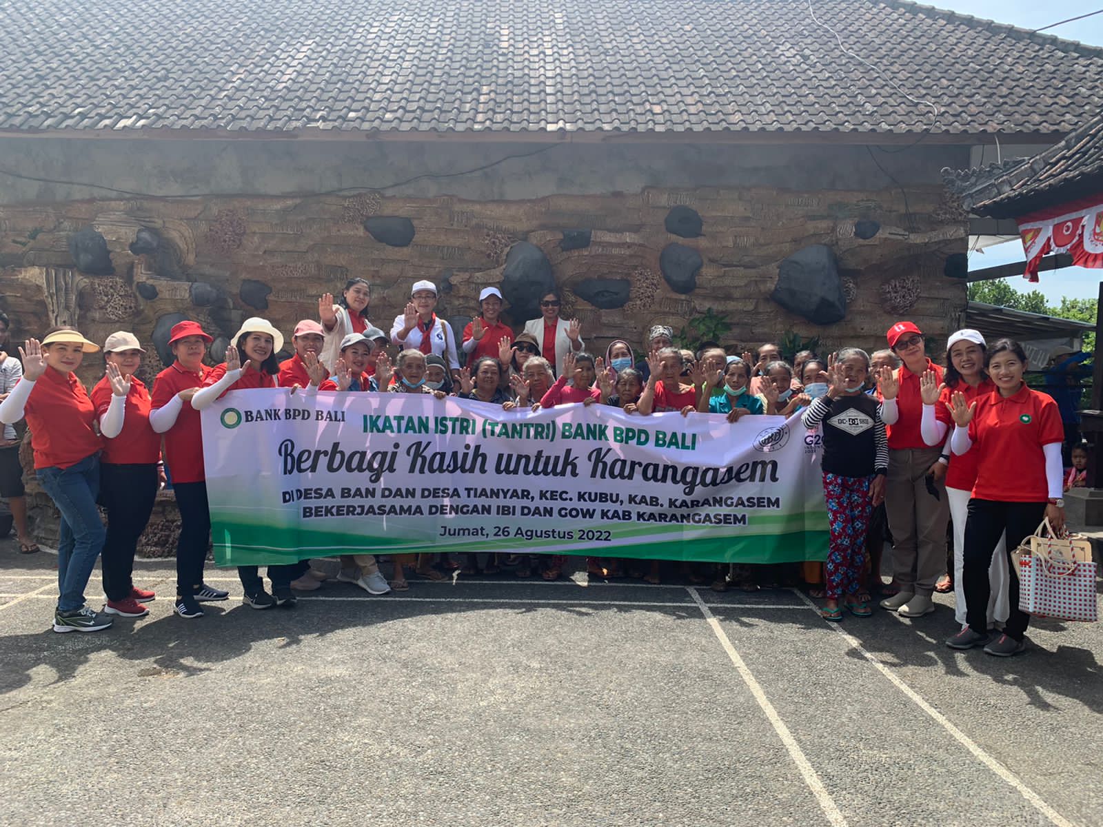 KARANGASEM – Berbagai wujud kepedulian sosial terus digerakan oleh Ikatan Istri (Tantri) Bank BPD Bali. Kali ini, untuk mendukung program pemerintah dalam mencegah dan mempercepat penurunan angka stuntingatau kekurangan gizi, Tantri Bank BPD Bali menggandeng Ikatan Bidan Indonesia (IBI) Karangasem bersama Gabungan Organisasi Wanita (GOW) Karangasem menggelar bakti sosial bantuan paket sembako di dua desa, yakni Desa Ban dan Desa Tianyar, Kecamatan Kubu, Karangasem, Jumat (26/8/2022).