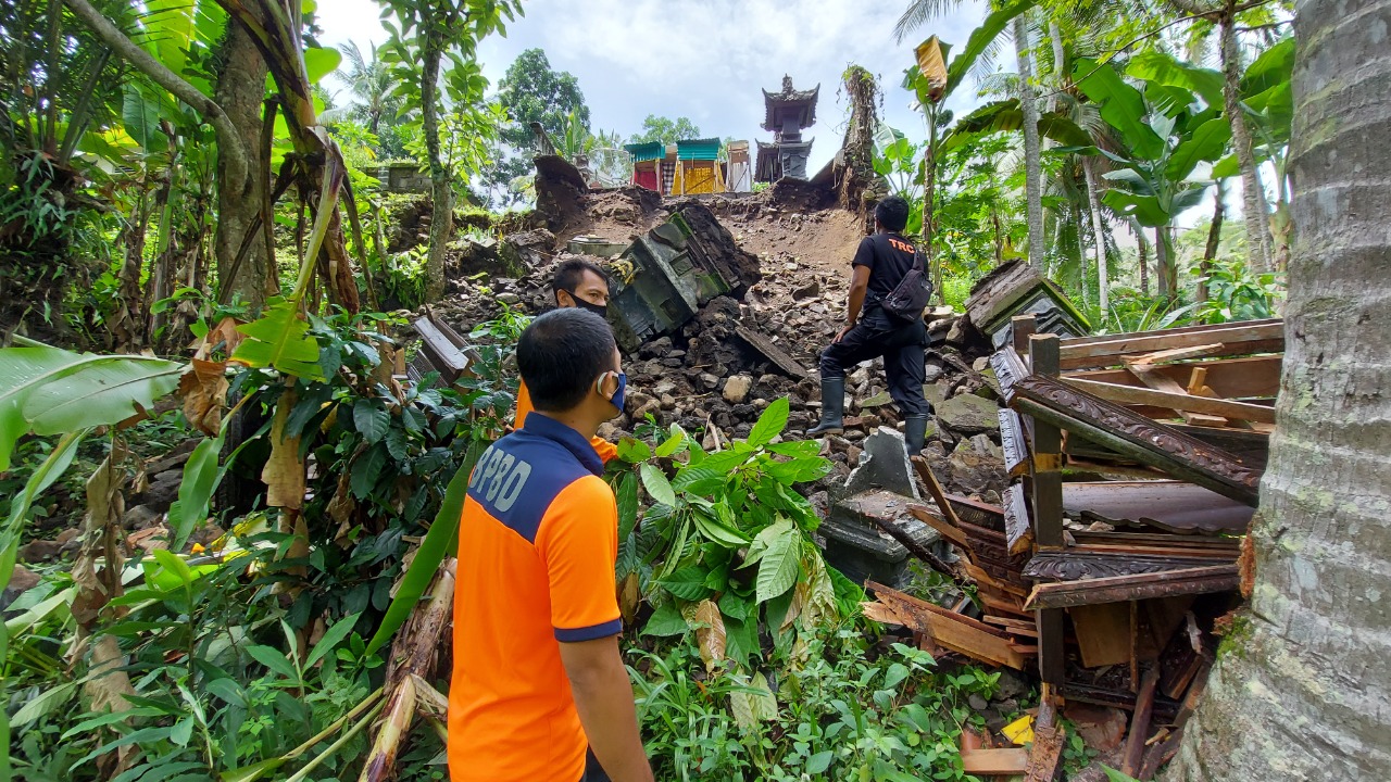 “Sebelumnya hujannya lebat sekali selama seharian penuh dari pagi sampai malam. Nah sekitar pukul 03.00 Wita kalau tidak salah, senderan pelinggihnya ini longsor yang menyebabkan beberapa bangunan pelinggih ikut terbawa longsoran,” ungkap Kadus Belong, I Kadek Jumarlana.