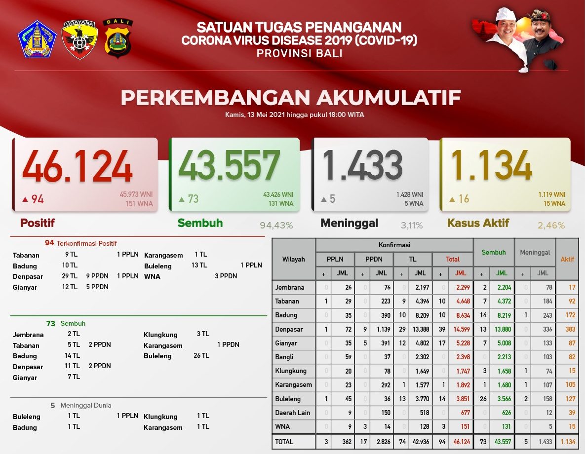 Secara kumulatif kasus positif covid-19 di Bali sampai Kamis (13/5/2021) berjumlah mjd 46.124 orang (45.973 WNI dan 151 WNA). Dari jumlah itu, sebanyak 43.557 orang (94,43%) sudah sembuh, dengan rincian 43.426 WNI dan 131 WNA.
