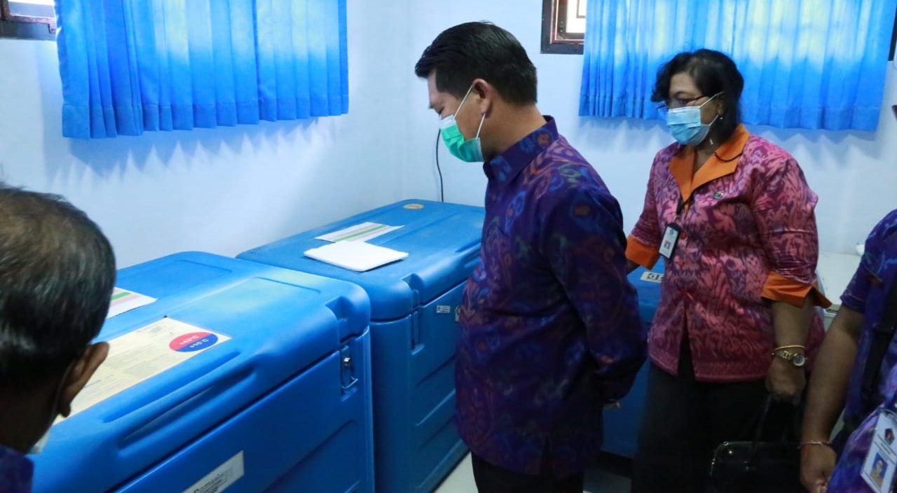 KLUNGKUNG – Bupati Klungkung, I Nyoman Suwirta, mengunjungi lokasi penyimpanan vaksin Covid-19 di UPTD Instalasi Farmasi Banjarangkan bersama Kepala Dinas Kesehatan, dr. Made Adi Swapatni, Selasa (26/1/2021).