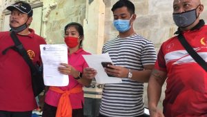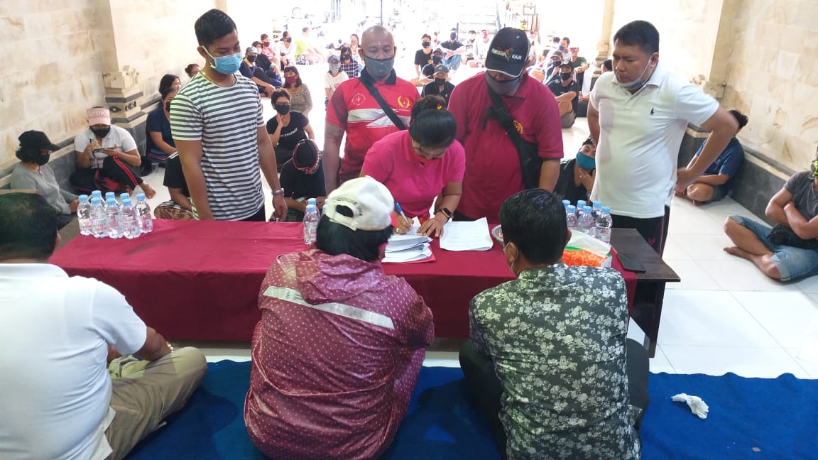 DENPASAR – Ketua PKK Banjar Kertajati, Desa Pemecutan Kaja, Denpasar Utara mengucapkan Ikrar dan Penandatanganan kesepakatan bersama tentang kepatuhan dalam memutus mata rantai penyebaran Covid-19 di Banjar Kertajati pada Minggu (12/7/2020).
