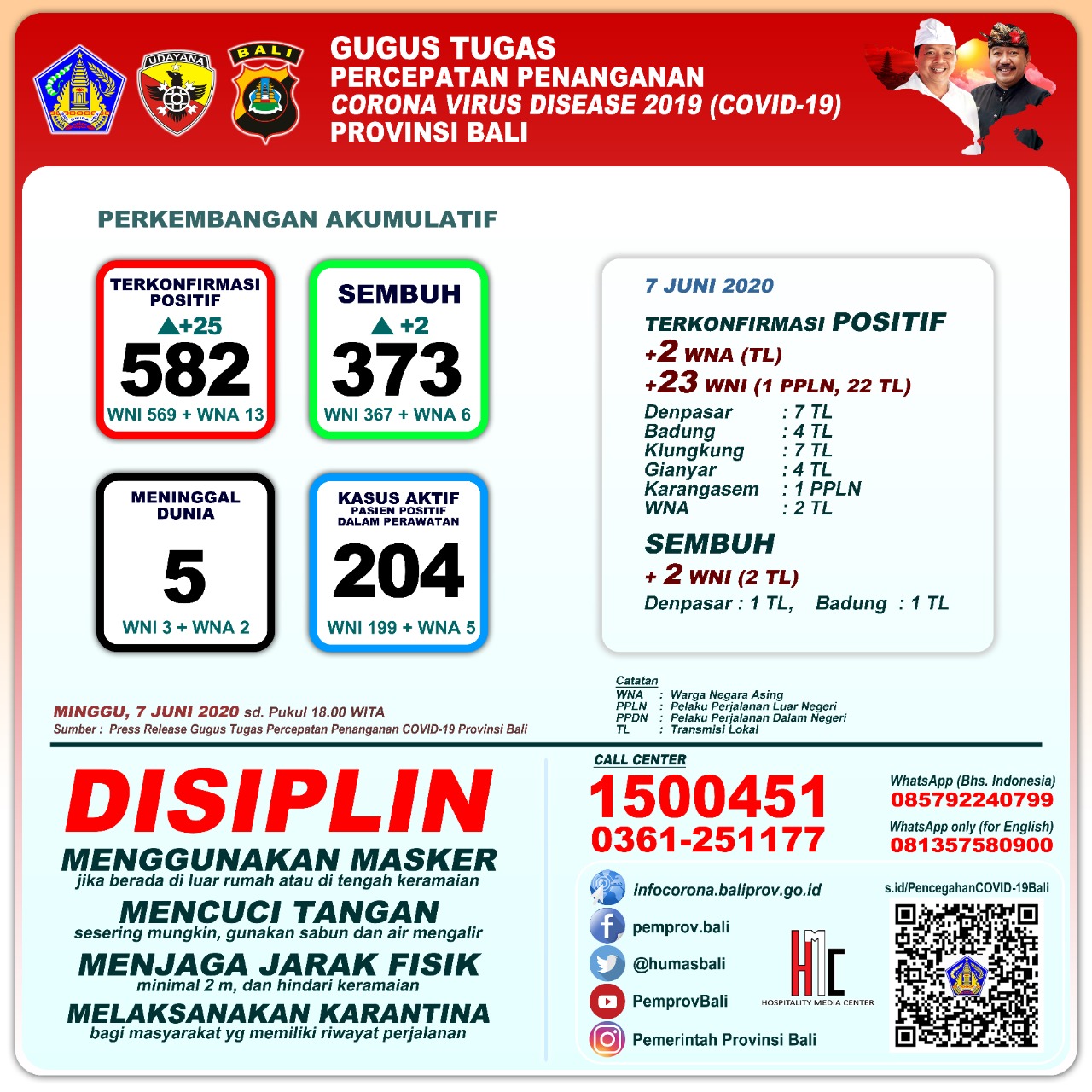 Rinciannya; Klungkung (7 orang), Denpasar (7), Badung (4) dan Gianyar (4). Sedangkan satu pekerja migran Indonesia yang terinfeksi Covid-19 dari Kabupaten Karangasem. ”Dengan tambahan 25 kasus baru itu, jumlah kumulatif kasus positif Covid-19 di Bali menjadi 582 orang (569 WNI dan 13 WNA),” ungkap Dewa Indra.