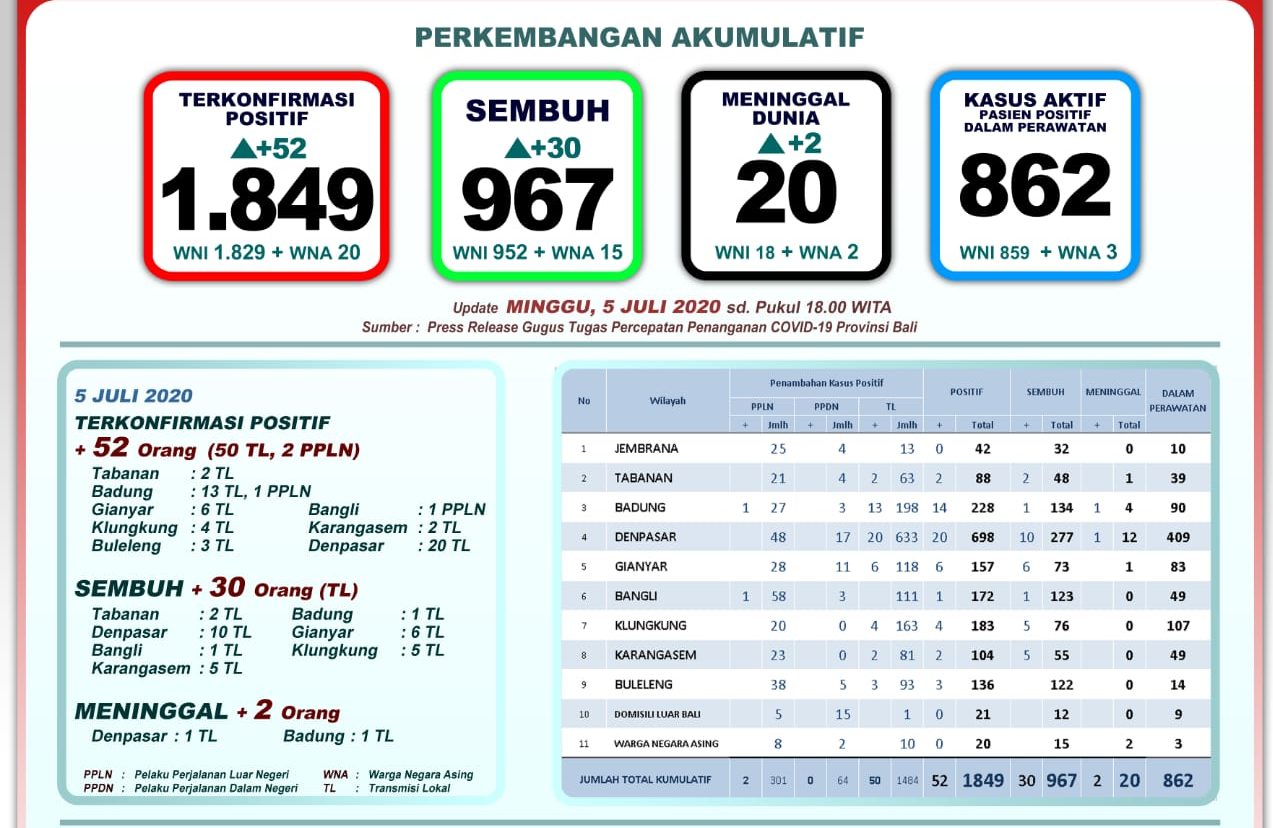 Kota Denpasar secara rutin menjadi penyumbang terbanyak 20 orang TL, disusul Badung 14 orang ( 13 TL dan 1 PPLN), Gianyar 6 TL, Klungkung 4 TL, Buleleng 3 TL, Tabanan 2 TL, Karangasem 2 TL dan Bangli 1 PPLN. Dengan demikian, jumlah kumulatif pasien positif di Bali sebanyak 1.849 orang.