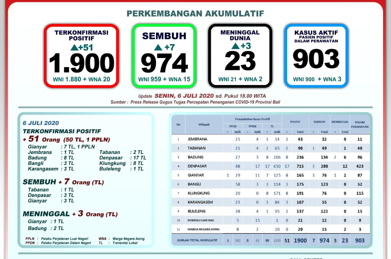 Kabar baiknya di hari yang sama Senin (6/7/2020), tujuh pasien yang tertular karena transmisi lokal, dinyatakan sembuh setelah menjalani perawatan intensif. Tujuh pasien yang sembuh itu, 3 orang warga Denpasar, 1 orang dari Tabanan dan 3 orang lagi dari Kabupaten Gianyar. Total pasien sembuh di Bali, kini menjadi 974 orang.