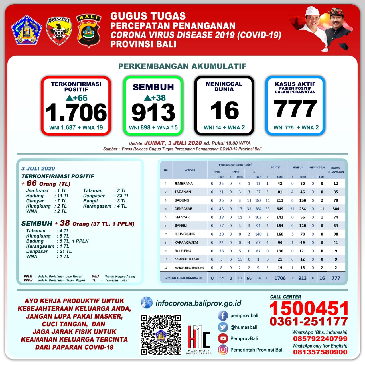 DENPASAR – Ketua Harian Gugus Tugas Percepatan Penanganan (GTPP) Covid-19 Provinsi Bali, Dewa Made Indra menyampaikan perkembangan harian kasus covid-19, Jumat (3/7/2020) dengan penambahan pasien sembuh lumayan meningkat signifikat sebanyak 38 orang, sementara yang meninggal nihil alias tetap 16 orang (14 WNI, 2 WNA).