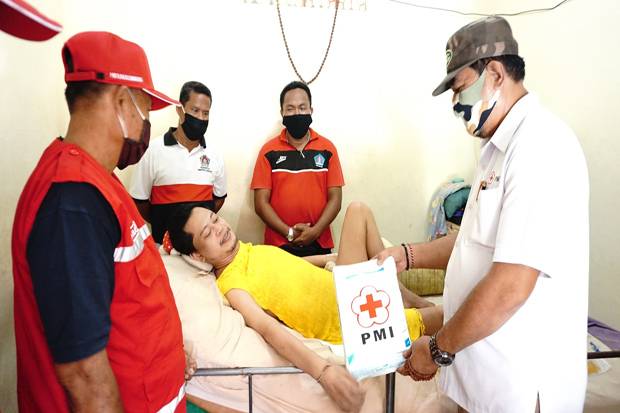 Ketua PMI Cabang Klungkung yang juga Wakil Bupati Klungkung, I Made Kasta, menyerahkan bantuan paket sembako kepada penderita lumpuh, I Ketut Sucitawan (36) di Dusun Pundukdawa, Desa Pesinggahan, Kecamatan Dawan, Jumat (26/6). Sucitawan menderita kelumpuhan sejak sembilan tahun silam usai mengalami kecelakaan di Jalan Bypass Ida Bagus Mantra, Klungkung. Kini ia tinggal dan dirawat oleh anak semata wayangnya Ni Putu Mira Cahya Devani (9) dibantu kerabat dan keluarga dekatnya, mengingat sang istri telah pergi untuk selamanya saat kecelakaan itu terjadi. “Kondisi saya sudah seperti ini sejak sembilan tahun lalu usai kecelakaan,” ujarnya dihadapan Wabup Kasta.