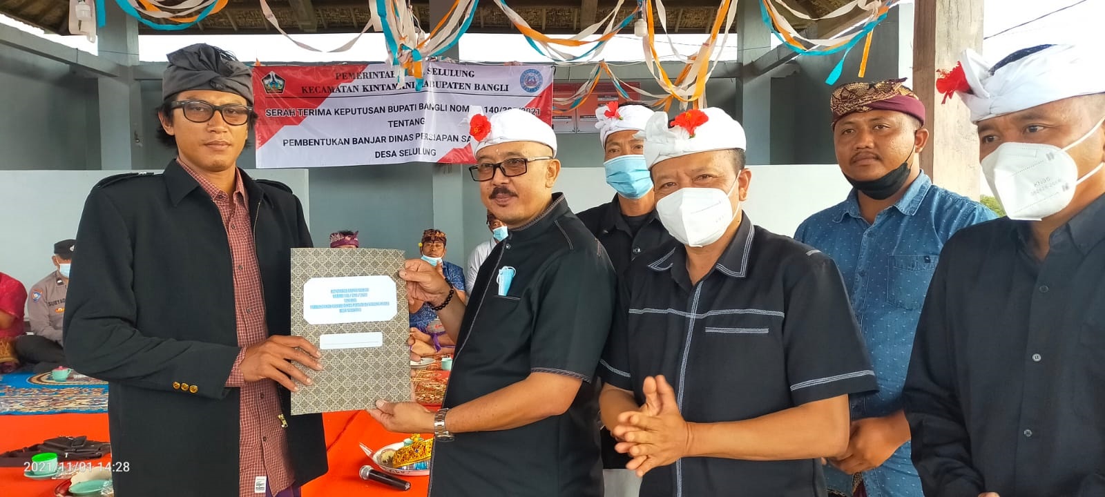 BANGLI – Meningkatkan pelayanan publik dan mewujudkan efektivitas pelayanan publik, Wakil Bupati Bangli, I Wayan Diar, menyerahkan Surat Keputusan Bupati Bangli tentang Pembentukan Banjar Dinas Persiapan Sabang Kelod, Desa Selulung; dan Banjar Dinas Persiapan Mayungan, Desa Pengejaran, Kecamatan Kintamani di Balai Banjar Sabang Kelod dan Balai Banjar Pengejaran, Senin (1/11/2021). Turut hadir Ketua DPRD Bangli, I Ketut Suastika; Kepala Dinas Pemberdayaan Masyarakat dan Desa Bangli, I Dewa Agung Bagus Riana Putra; dan Camat Kintamani, I Wayan Bona.