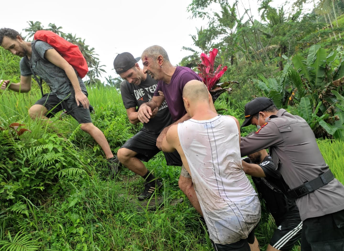 Tidak begitu lama, datang personel gabungan Polsek Tegallalang yang dipimpin Kanit Binmas, Ipda I Ketut Gandra, ke TKP dengan membawa tandu. Karena sulitnya medan dan situasi hujan lebat, evakuasi tidak bisa menggunakan tandu. Korban akhirnya dievakuasi dengan berjalan kaki, dibantu teman-temannya dengan cara dipapah dan dipegang.
